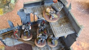 The Company Commander struck at the Kill Team, killing two with his Power Fist. In reply, the lone surviving Kill Team member struck down the Commander with his Heavy Thunder Hammer.