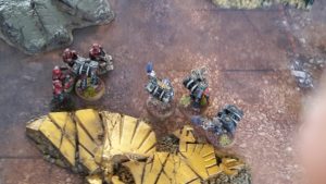 The Kill Team in the crater in my deployment zone fired at the lone Inceptor Marine, only managing to wound him once.