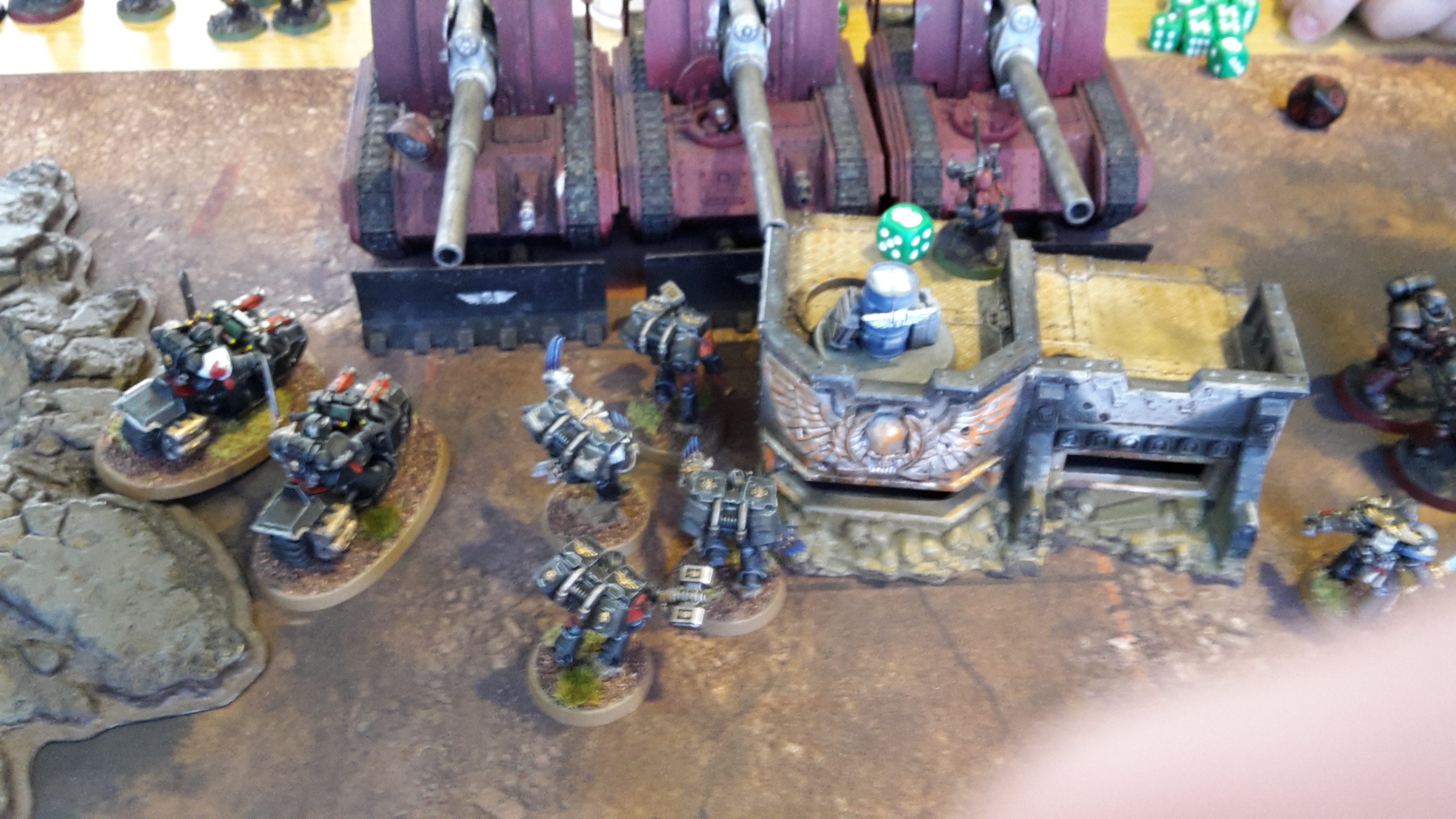 The Watch Master and Librarian advanced on the Primaris Marines in front of them, while the lone Veteran with the Heavy Thunder Hammer moved up on the damaged Hydra tank. The Vanguard Veterans moved to engage the enemy Basilisks, joined by the Bike squad to their left.