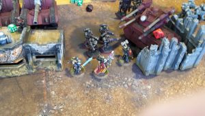 The Veteran squad attempted to assault the Primaris Marines in the ruins, but failed their 5″ charge. Fortunately, they suffered no damage from overwatch.