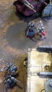 In the other combat, the Bikers struck at the squad, hitting twice, but failing to wound. In reply, one of the Bikers took a single wound.