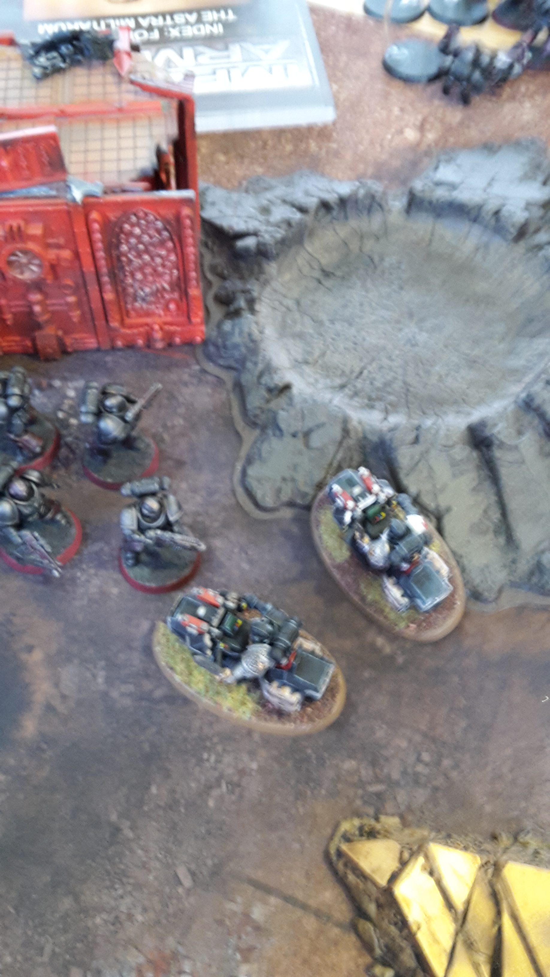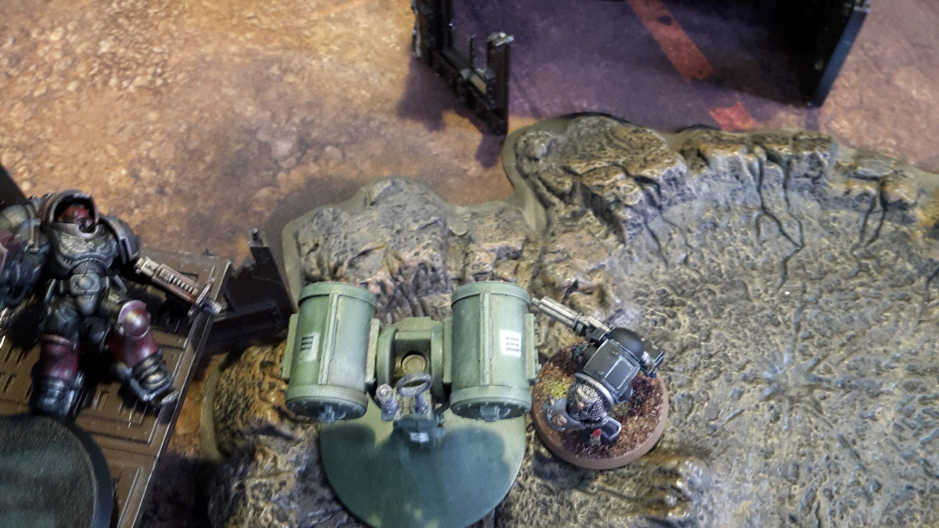 The Deathstrike fired it missile at the Kill Team in the crater, killing all the Veterans and wounding the Terminator. The nearby Inceptor Marine fired at the Terminator, but was unable to kill him. One of the Basilisks opened fire on the Terminator, but was unable to wound him.