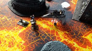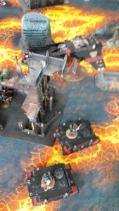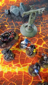 The War Walker opened fire on the Deathwatch Flyer, hitting and wounding with its Bright Lance, but only doing 1 wound with the shot. The Scatter Lasers fired at the front Bikers, wounding once, but failing to get past their armour. The second War Walker followed suit, failing to hit with its Bright Lance, and failing to get through the armour of the Bikers with its Scatter Laser.