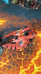 The Kill Team in the trenches fired their Meltaguns at the Wave Serpent, hitting four times and wounding four times (after the use of a Command re-roll). The Meltaguns where sufficient to destroy the enemy skimmer. The Howling Banshees and Jain Zar disembarked from the transport unharmed.