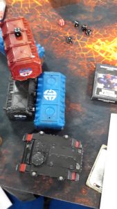 The Watch Captain moved into the cover of the containers, while the Rhino moved up behind the barricade, the Watch Master disembarking to secure the objective.