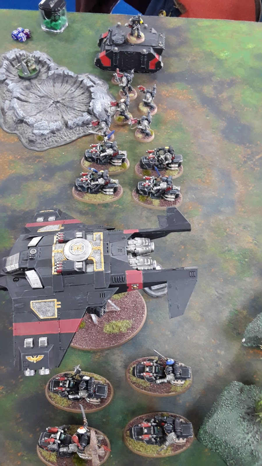 Jonathan chose his deployment side. I was set to deploy the first unit. After checking Jonathan’s list, I saw that he had 8 deployment drops. If I set up normally, I would have 9 drops and would most likely lose the first turn. After thinking for a few minutes, I decided that if I put the Watch Captain in the Corvus Blackstar and deployed the Watch Master in one of the Rhinos, I could also get down to 8 drops and could choose to go first. The deployment order was as follows: