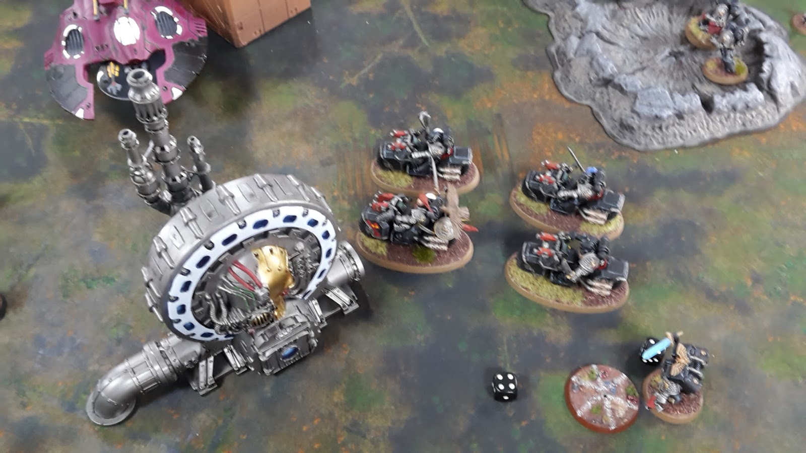In the psychic phase, the Farseer attempted to Doom the Bikers. He failed the initial roll, but used his Farseer’s ability to re-roll and pass. He then attempted to Smite the Corvus Blackstar, but rolled a double 1 and perilled. He used a Command re-roll to pass, putting three wounds on the Deathwatch Flyer. The Spiritseer attempted to Conceal the Dire Avengers, but perilled on a double 1 once more, suffering two wounds in the process.