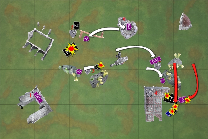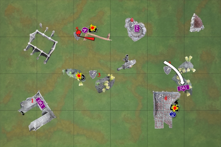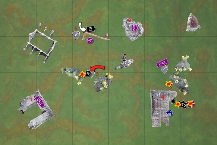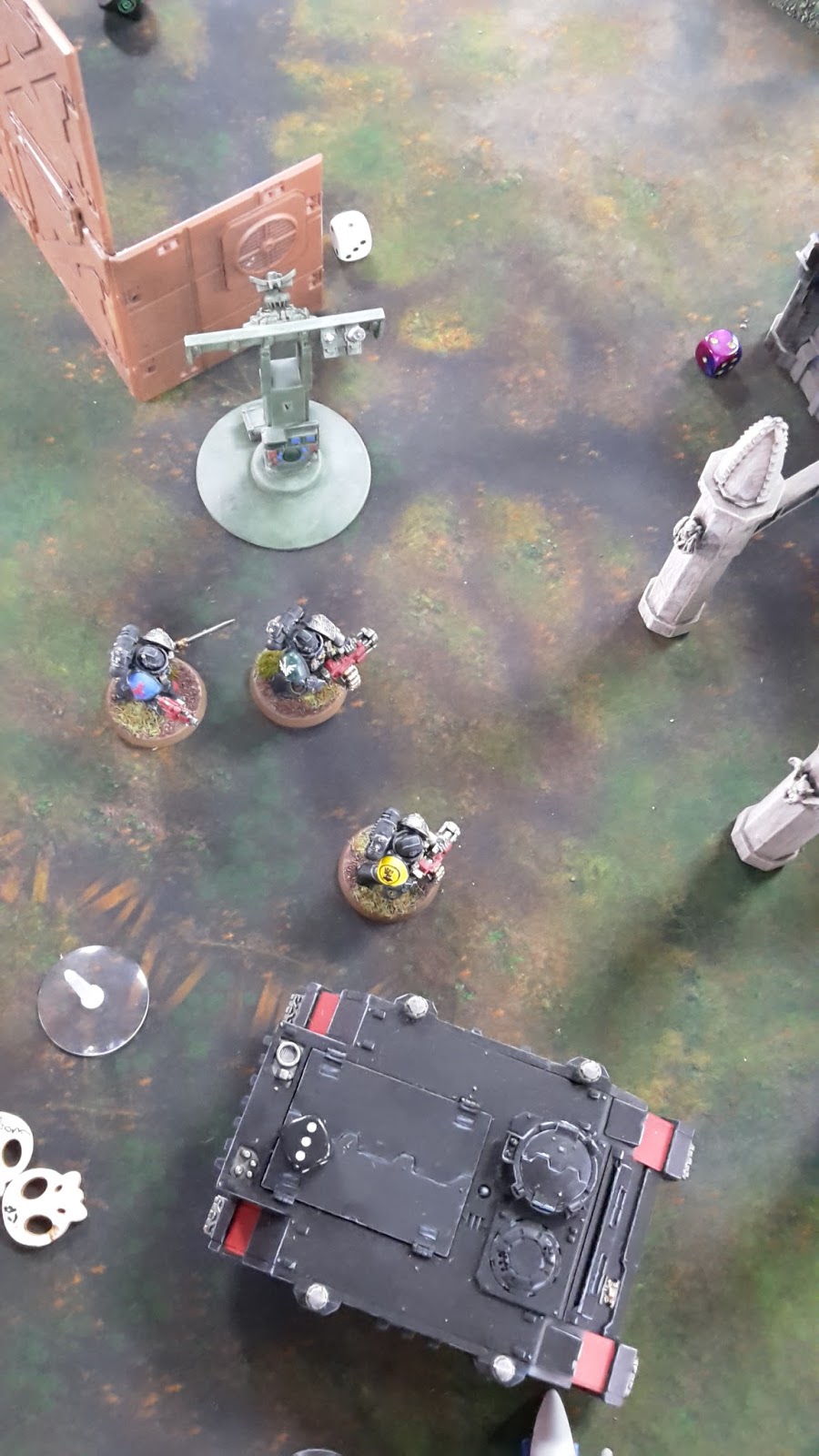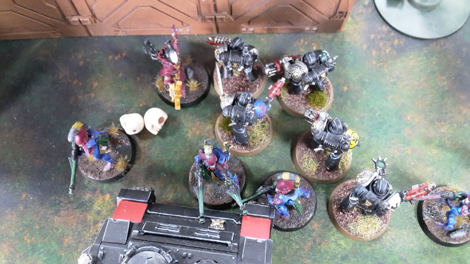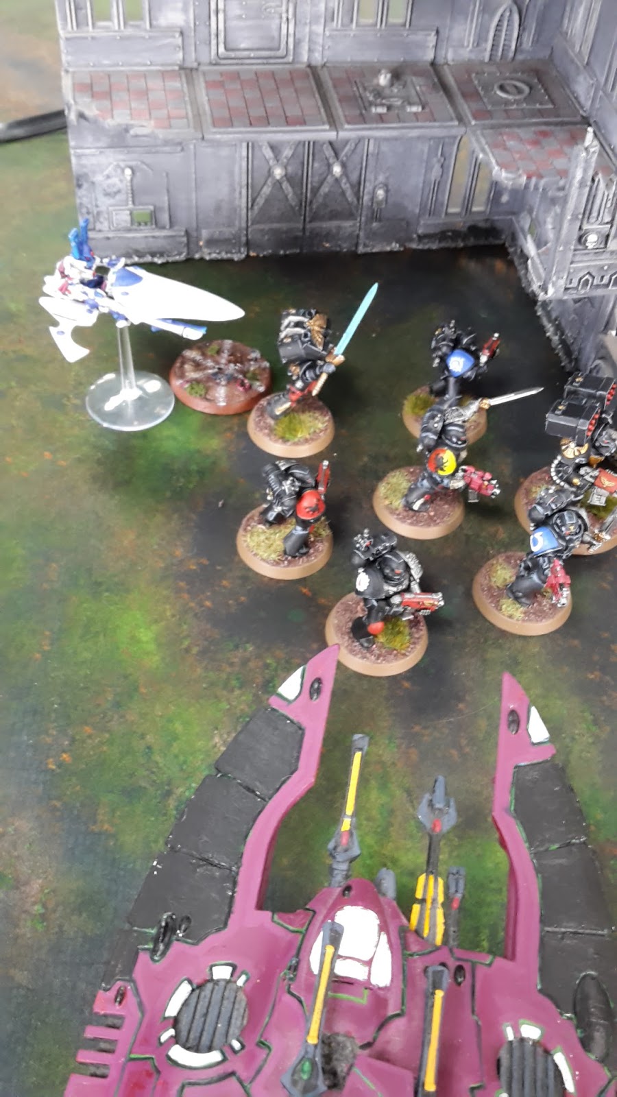 In the assault phase, the three squads struck at the Wave Serpent, finally destroying the enemy vehicle. One of the Fire Dragons perished as they disembarked, the Deathwatch consolidating to engage with the newly emerged Warriors.