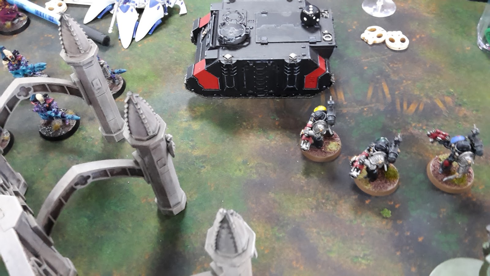 The Fire Dragons fell back from the Deathwatch, as the surviving Wave Serpents and Singing Spears moved up to engage. Both squads of Dire Avengers disembarked and advanced on the Watch Captain and the Rhino, supported by the Farseer on one flank and the Spiritseer on the other. The Autarch moved to support the Dark Reapers on the right flank, as the second unit of Dark Reapers moved around the abandoned church to target the Deathwatch.