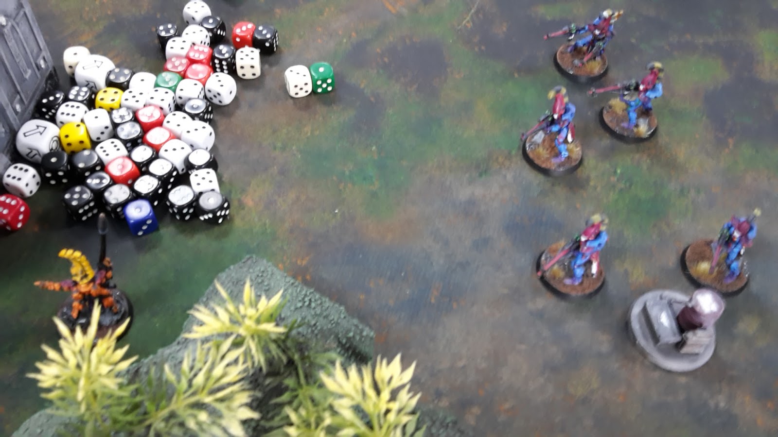 The Dire Avengers on the left flank fired at the Kill Team in the crater, killing one of them.