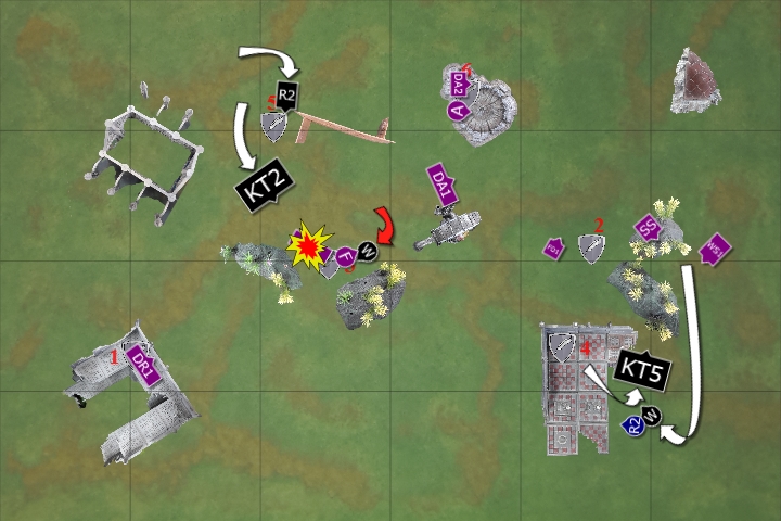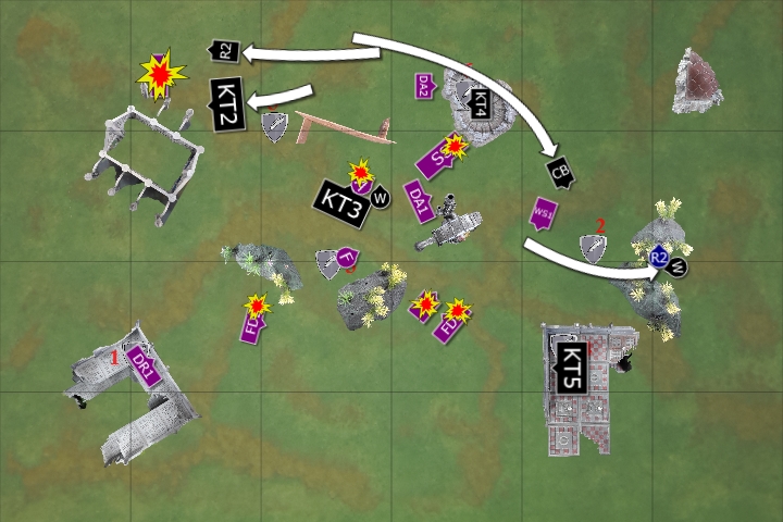 The Deathwatch Bikers moved up to support the Watch Captain, as he retreated with the Relic. The Kill Team disembarked from their Rhino to target the Dire Avengers, as the Corvus Blackstar moved to support. As the flyer passed over the shining spears, it dropped its bomb payload, but failed to do any damage. The other Rhino moved around the ruins to enter the fight.