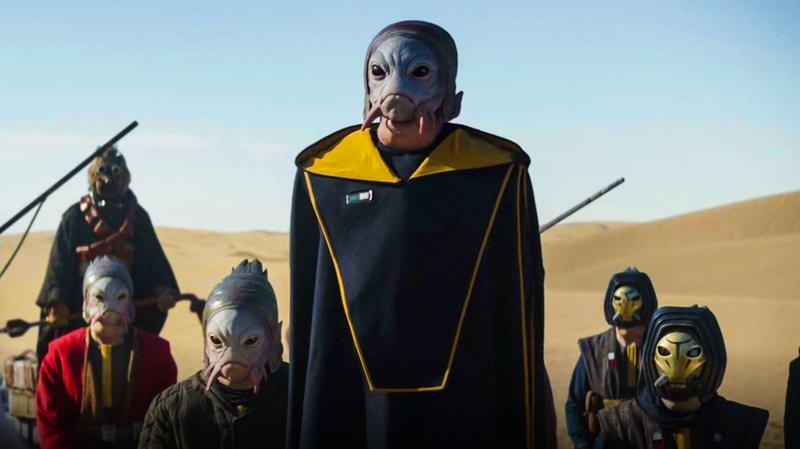 Now that the Tusken’s finally understand that Boba Fett is indeed an ally they put him through a rite of passage to create his very own Gaffi stick. Albeit with a super intrusive Lizard that crawls up his nose, Boba Fett marches through the desert to find a stick and comes back to create his Gaffi stick with the help of the Tusken’s with the final shot showing his acceptance into the Tusken Tribe.