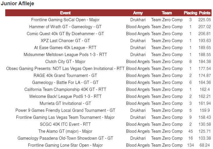 Junior has been Team Zero Comp’s Blood Angels player, but has been messing around with Drukhari having a great showing over at SoCal not too long ago. Strong player to contend for the top 8.