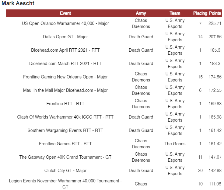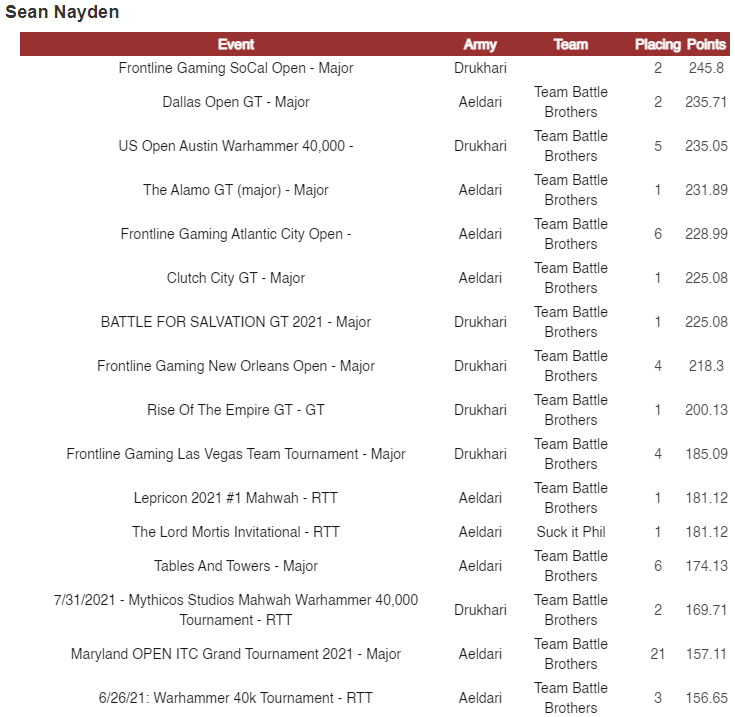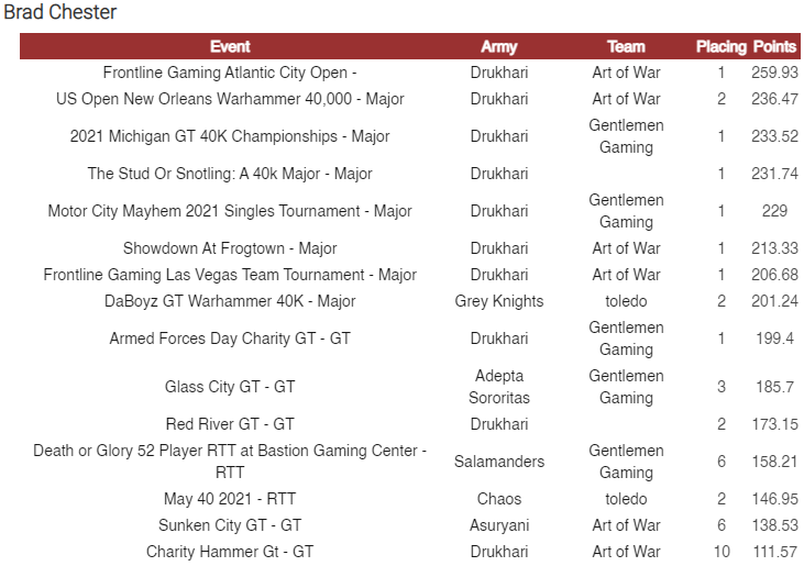 Brad has been hard at work with Drukhari and being the #1 ranked in faction along with being #2 overall is nuts. We’ve seen him at the top tables multiple times so we’ll see if this event becomes an Art of War finals or not.