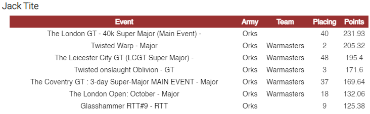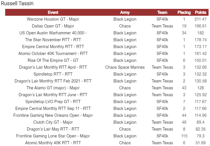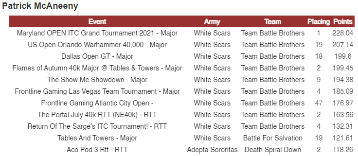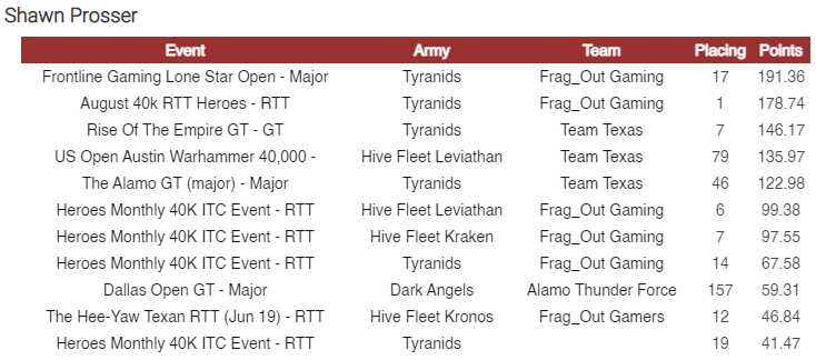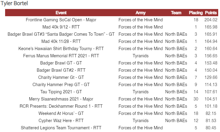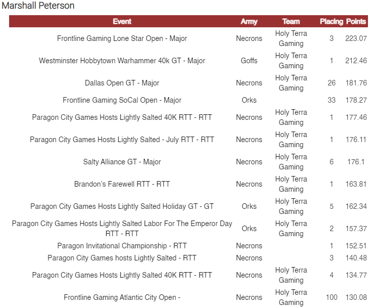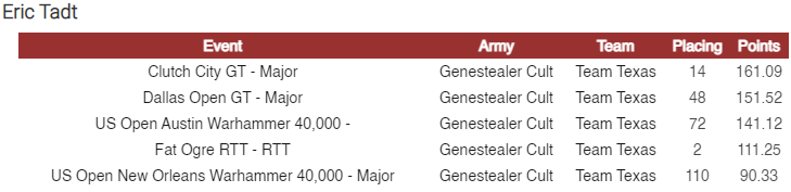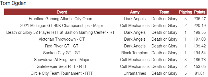 There’s not much to say about Tom besides the fact that he’s incredibly consistent. Placing top 4 in a majority of his events be it a Major, RTT or GT this guy is a monster that has his Dark Angels dialed to it’s max effectiveness.