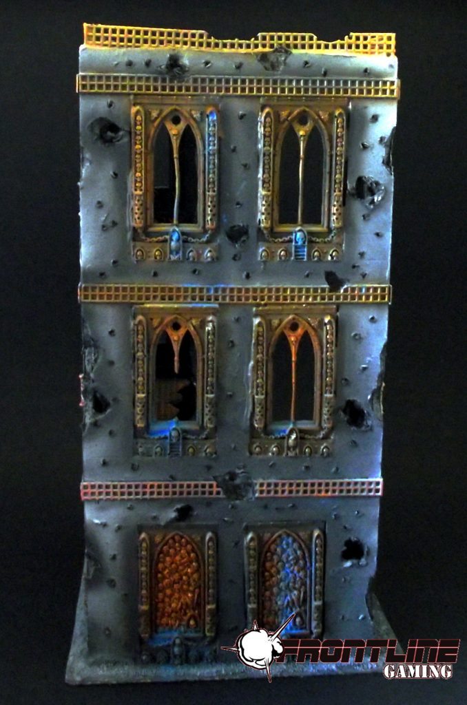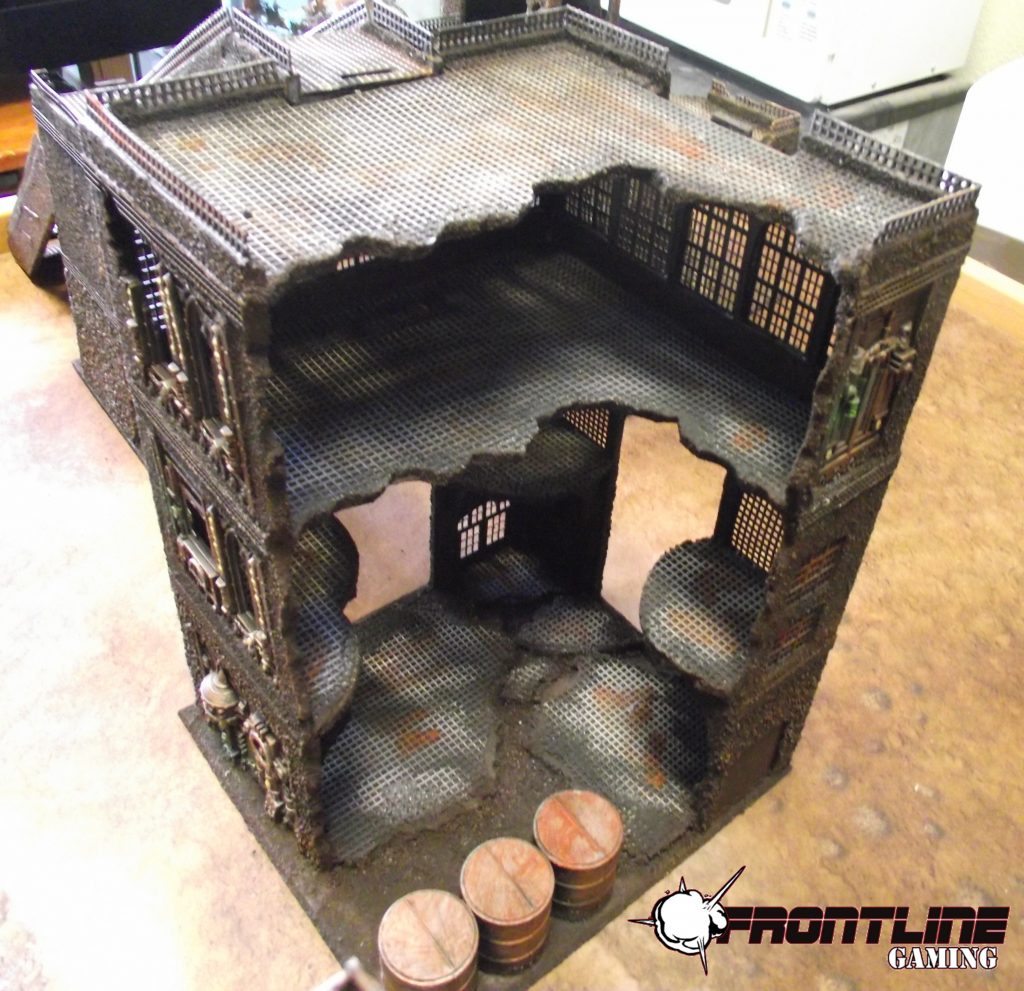 Our basic package starts out at $350 for a set of custom built and painted terrain that will be sufficient for a 4×6′ space. This includes 2 large, multi-story buildings, 4 barriers such as fences or walls, and 4 pieces of custom area terrain that will cover a roughly 1×1′ area. This gives you a good level of coverage with 2 centerpiece terrain kits that really make your table stand out. These buildings will be painted to an excellent tabletop standard.